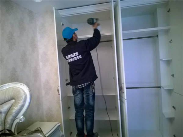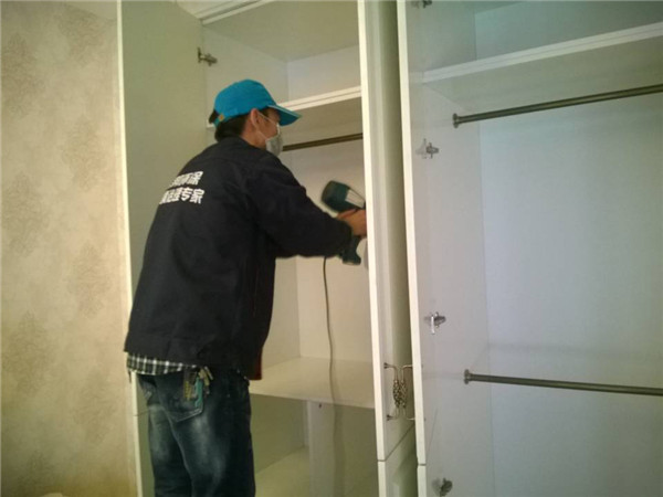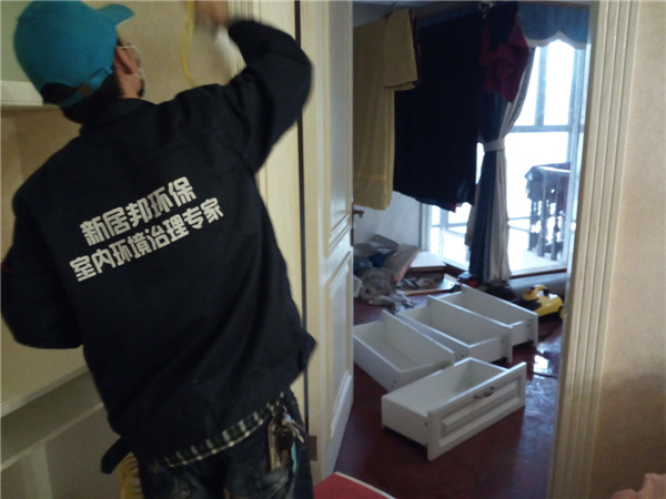 主要污染源:板木结合的衣柜、壁纸、以及定制的酒柜、橱柜、窗帘;茶几电视柜内衬板等,治理前检测显示甲醛超标,房间有明显异味