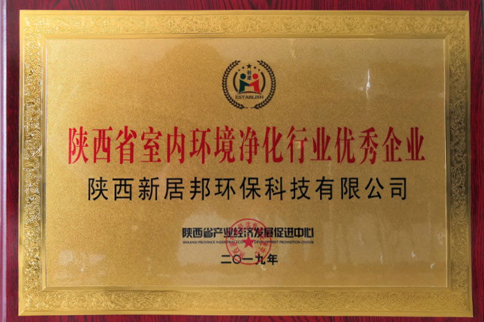 陕西省室内环境净化行业优秀企业荣誉称号!