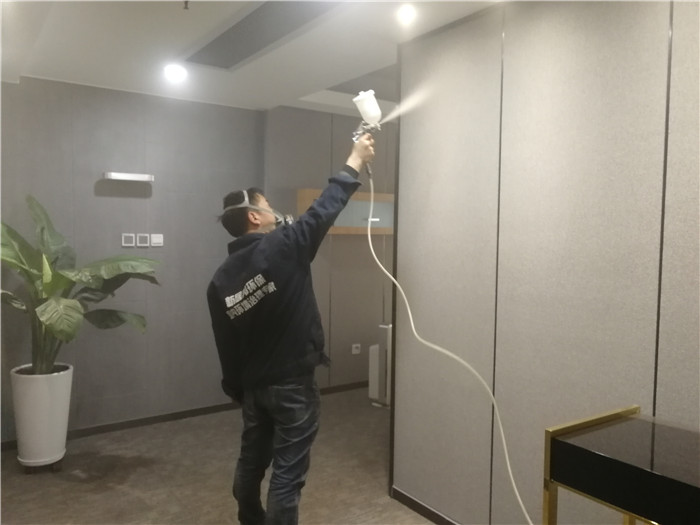 这一步骤是具体除醛操作的最后一步,技术人员完成了去味、除醛作业后,才可以进入到该步骤,光触媒的喷涂需要高雾化、超精细,无死角,全面性,对施工操作人员喷涂技术要求较高。喷涂的基材面包含墙面、天花、窗帘、家具表面、灯具等。