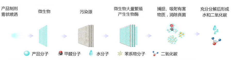 生物酶制剂中的微生物菌种在经过雾化喷涂于基材表面后,微生物菌在适宜的湿度和温度下呈几何级数繁殖,经过本身繁衍可产生生物酶,在微生物和酶的双重作用下,吞噬大量的有机物如甲醛、苯系物等异味源分子,自身将异味源的有机物彻底分解为二氧化碳和水,生物酶对室内空气污染中的主要有机物,如甲醛、苯系物、TVOC等空气污染作用明显;消弭和抑止含硫、氨和酸类化合物所产生的各种异味;房间内来自于地毯里面的霉味;呕吐物或者红酒、咖啡等食品污渍留下的异味;彻底消弭烟味、汗味、皮革味、宠物味等各种异味;无毒无二次污染。