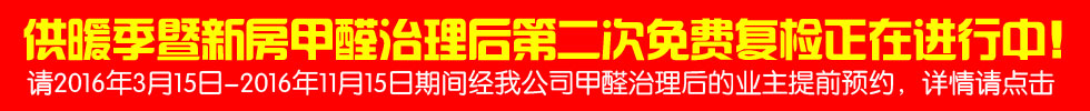 自2016年11月25日起,凡在2016年3月15日-2016年11月15日期间由我公司进行甲醛治理的所有住宅客户,我公司免费进行甲醛治理第一年内第二次免费上门复检服务。请各业主微信预约,合理安排复检时间。