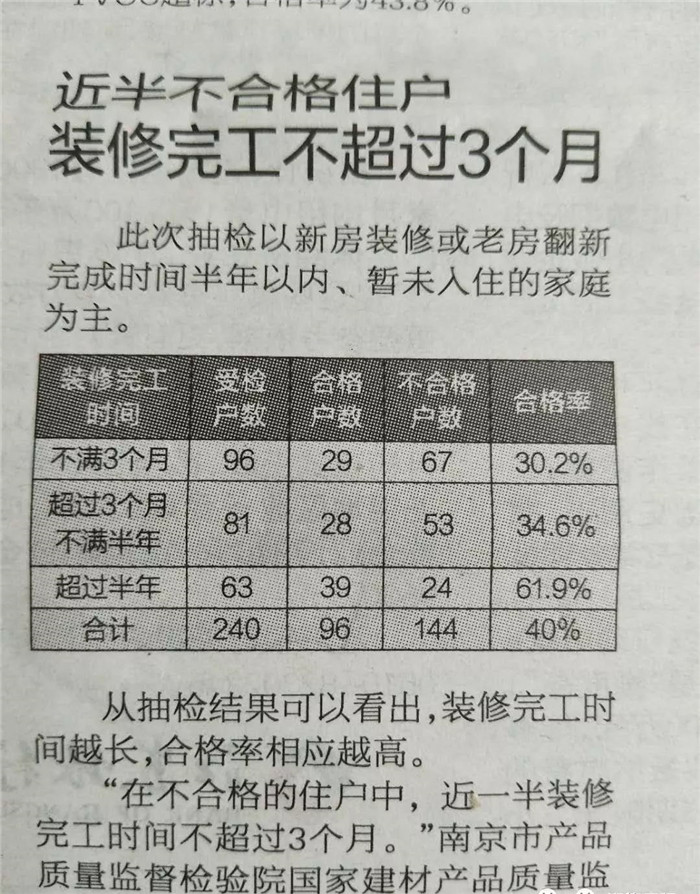 很多刚装修房子的朋友想必都听过,那就是房子装修完先晾一晾,把甲醛散去,通风三个月就可以入住了。下面,我们来看一看南京市质监局曾做过的一次关于室内空气检测方面的调查,结果令人吃惊,总体合格率仅为40%!